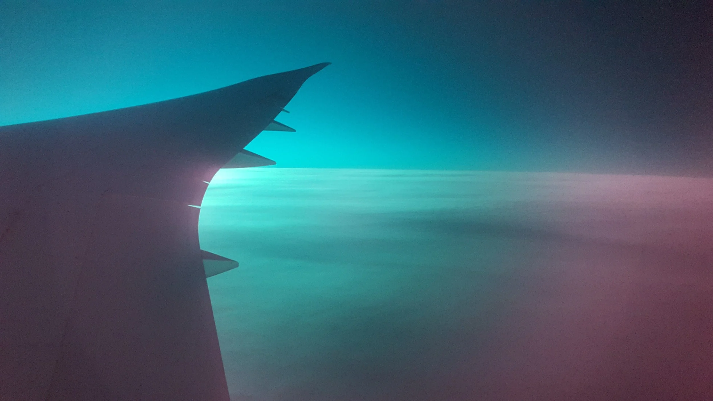 Crazy early morning light off the wing of our Boeing Dreamliner, somewhere over the Atlantic.